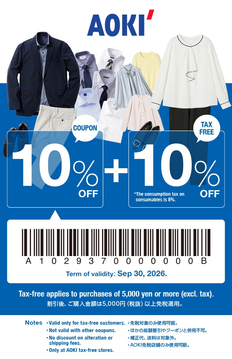 ・คูปองนี้สามารถใช้งานได้เฉพาะร้าน AOKI ที่มีบริการ Tax-Free เท่านั้น