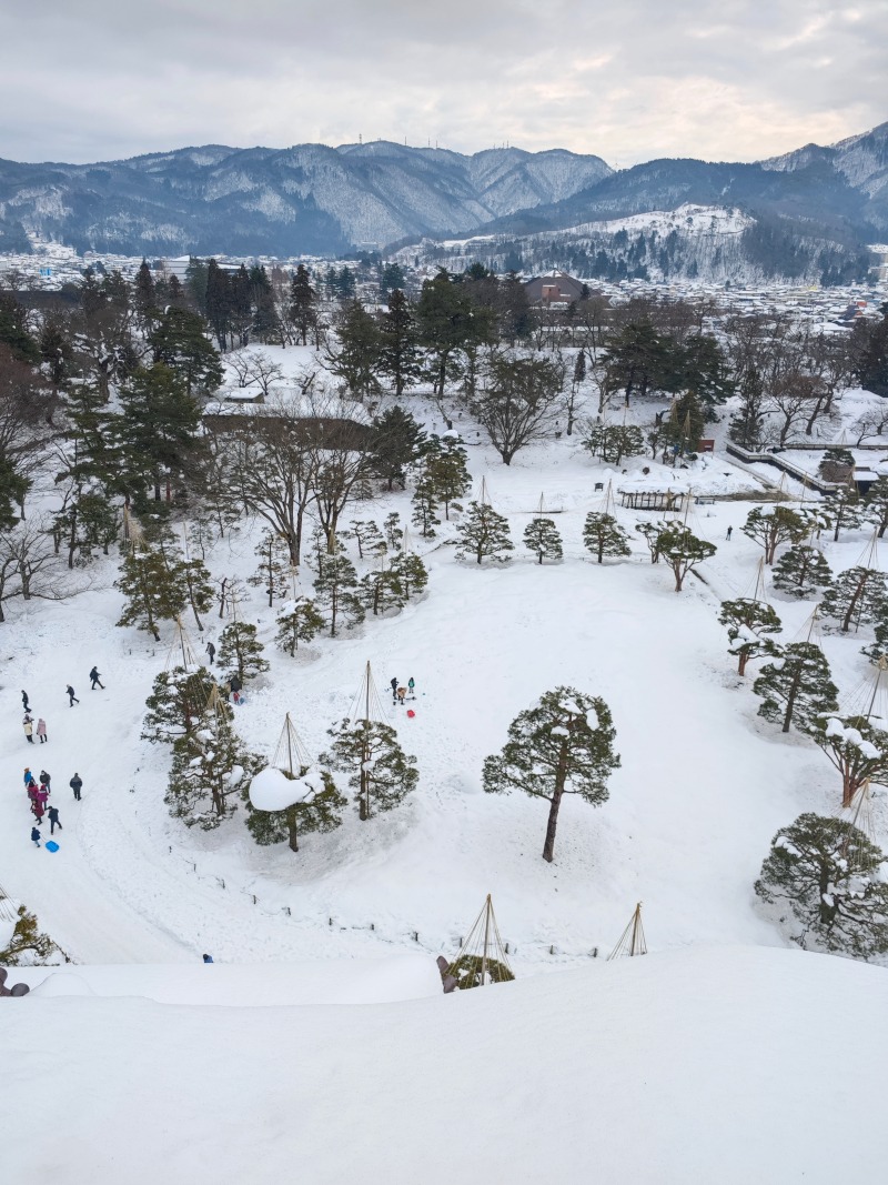 ทริปนี้ผมตั้งใจมาไอซุ (Aizuwakamatsu) เพราะอยากเห็น “ปราสาทสีขาวหลังคาแดง” ในวันที่หิมะตกแบบฟูๆ จริงๆ และพอได้มาเดินในสวนปราสาทช่วงเช้า…คือมันเงียบจนได้ยินเสียงรองเท้าตัวเองบดหิมะกรอบๆ
