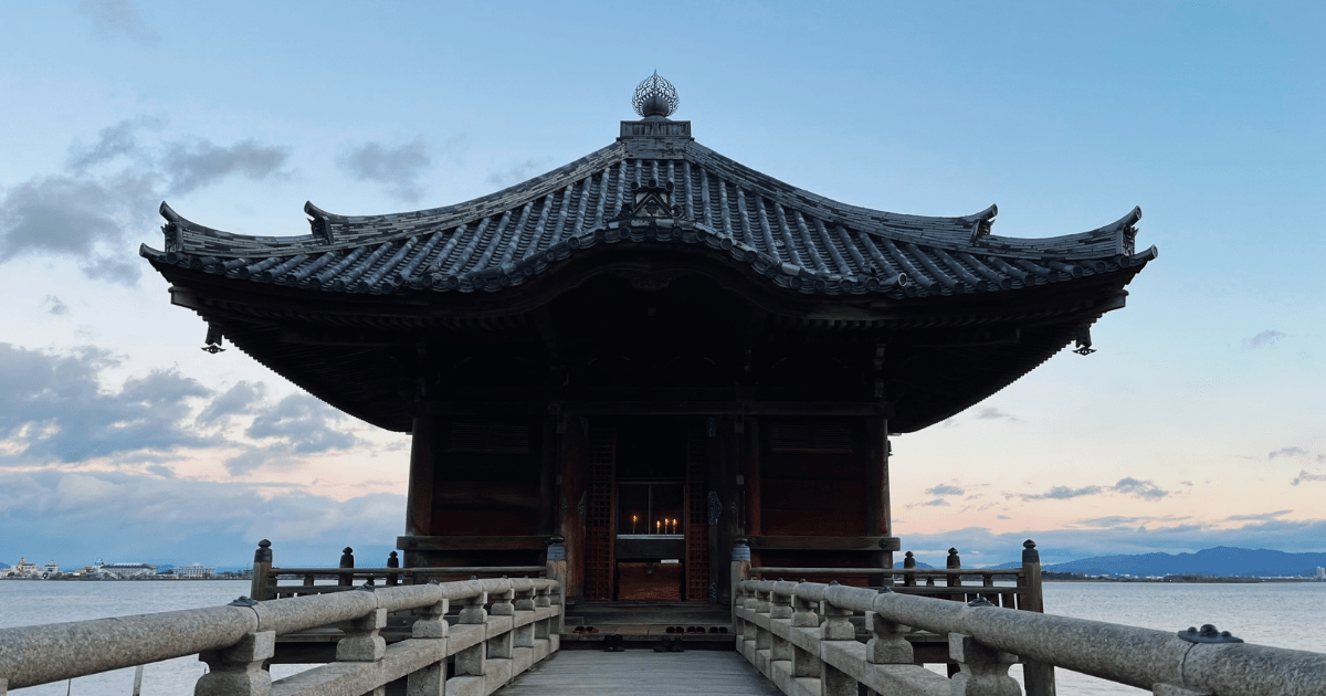 ศาลาแห่งนี้มีประวัติย้อนไปถึงสมัยเฮอัน (ราวศตวรรษที่ 9) เชื่อกันว่าสร้างขึ้นเพื่อสวดภาวนาให้ผู้ที่สัญจรทางน้ำเดินทางอย่างปลอดภัย ภายในประดิษฐานพระพุทธรูปอามิดะ ซึ่งชาวญี่ปุ่นเชื่อว่ามีความศักดิ์สิทธิ์และนิยมมาสักการะกันอยู่เสมอ ศาลาที่เห็นในปัจจุบันได้รับการสร้างขึ้นใหม่ในปี ค.ศ. 1937 แต่ยังคงรักษาบรรยากาศแบบดั้งเดิมไว้ได้อย่างดี ทำให้ที่นี่กลายเป็นอีกหนึ่งจุดชมวิวและถ่ายภาพที่งดงามริมทะเลสาบบิวะ
