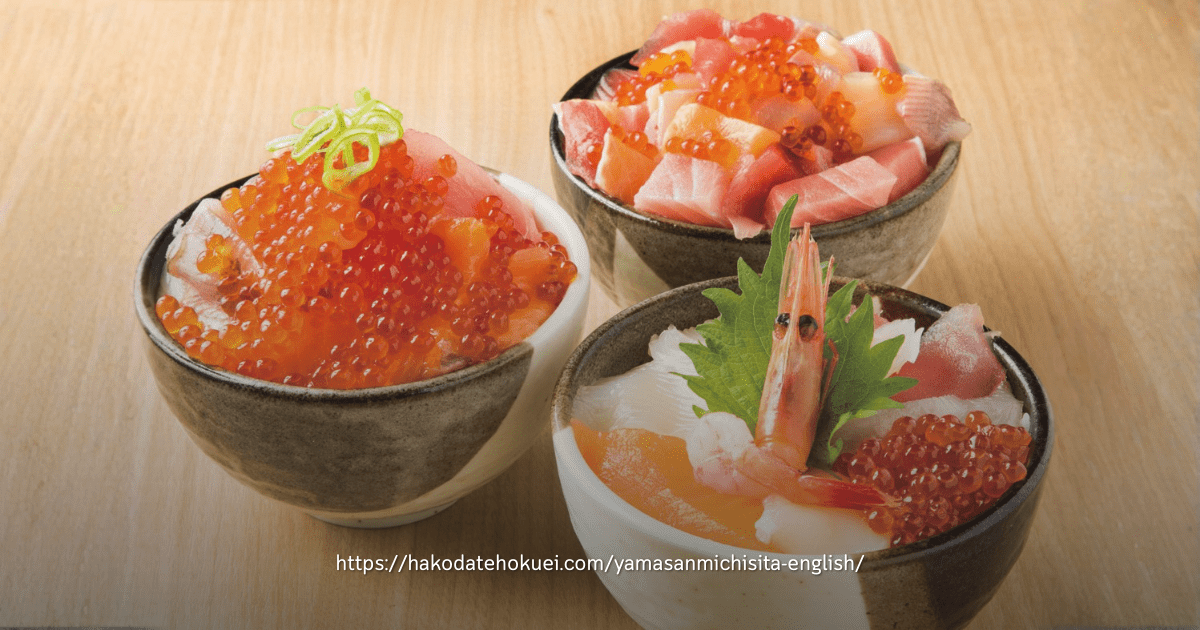 ตลาดเช้าฮาโกดาเตะ รวบรวมวัตถุดิบสดใหม่จากทะเลตอนเหนือมาไว้ในที่เดียว บรรยากาศของตลาดเต็มไปด้วยกลิ่นหอมของอาหารทะเลสด มีร้านเล็ก ๆ ตั้งเรียงรายรอบตลาด พร้อมเสิร์ฟข้าวหน้าอาหารทะเลที่อัดแน่นด้วยคุณภาพ ไม่ว่าจะเป็นอูนิ ไข่ปลาแซลมอน หอยเชลล์ หรือปูฮอกไกโด หลายร้านสามารถนึ่งหรือย่างให้ทานได้ทันที นอกจากนี้ยังมีผลไม้เกรดพรีเมียมอย่างเมล่อนและสตรอว์เบอร์รี่ ให้ได้ลองชิมและเลือกซื้ออีกด้วย