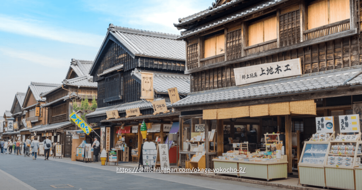 ย่านร้านค้าแบบญี่ปุ่นดั้งเดิมบนถนน Oharaimachi ที่ถูกสร้างขึ้นเพื่อจำลองบรรยากาศของเมืองหน้าศาลเจ้าในช่วงปลายสมัยเอโดะถึงต้นสมัยเมจิ เต็มไปด้วยอาคารไม้โบราณที่เรียงราย สร้างเสน่ห์แบบเมืองเก่าที่ชวนให้เดินเล่นและถ่ายรูปได้เพลินตลอดทาง